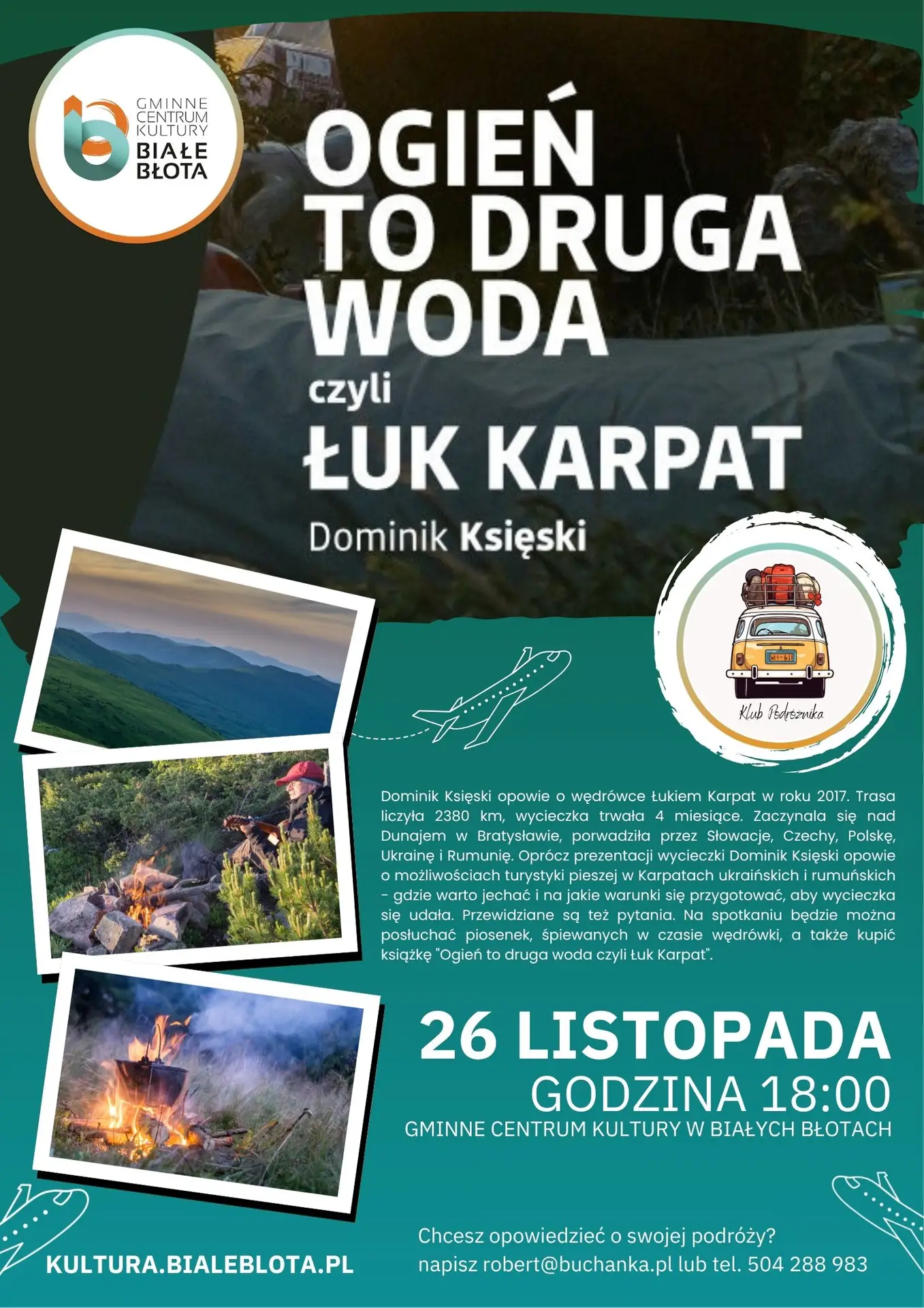 Dominik Księski opowie o wędrówce Łukiem Karpat w roku 2017. Trasa liczyła 2380 km, wycieczka trwała 4 miesiące. Zaczynala się nad Dunajem w Bratysławie, porwadziła przez Słowacje, Czechy, Polskę, Ukrainę i Rumunię. Oprócz prezentacji wycieczki Dominik Księski opowie o możliwościach turystyki pieszej w Karpatach ukraińskich i rumuńskich – gdzie warto jechać i na jakie warunki się przygotować, aby wycieczka się udała. Przewidziane są też pytania. Na spotkaniu będzie można posłuchać piosenek, śpiewanych w czasie wędrówki, a także kupić książkę „Ogień to druga woda czyli Łuk Karpat”.